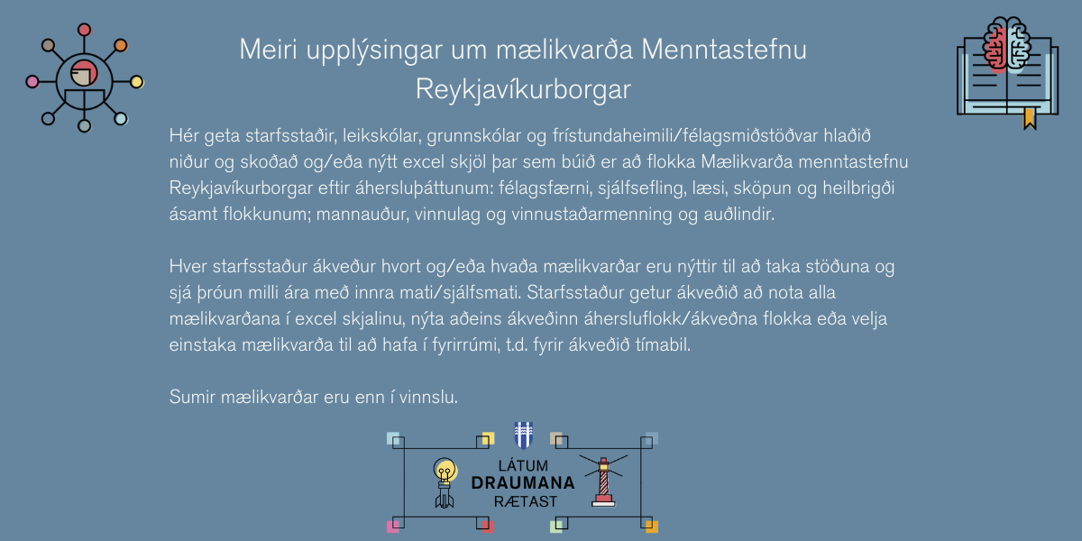 Starfsstaðir sem vilja skoða og/eða nýta mælikvarða Menntastefnu Reykjavíkur geta hlaðið niður meðfylgjandi excel skjölum og t.d. notað fyrir innra mat/sjálfsmat.