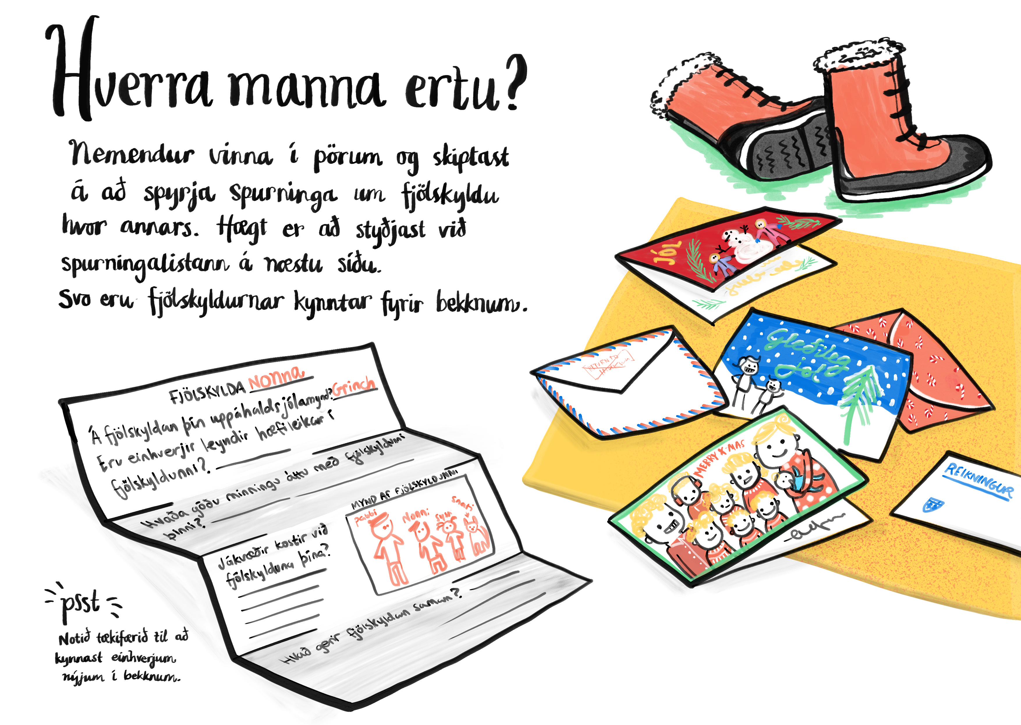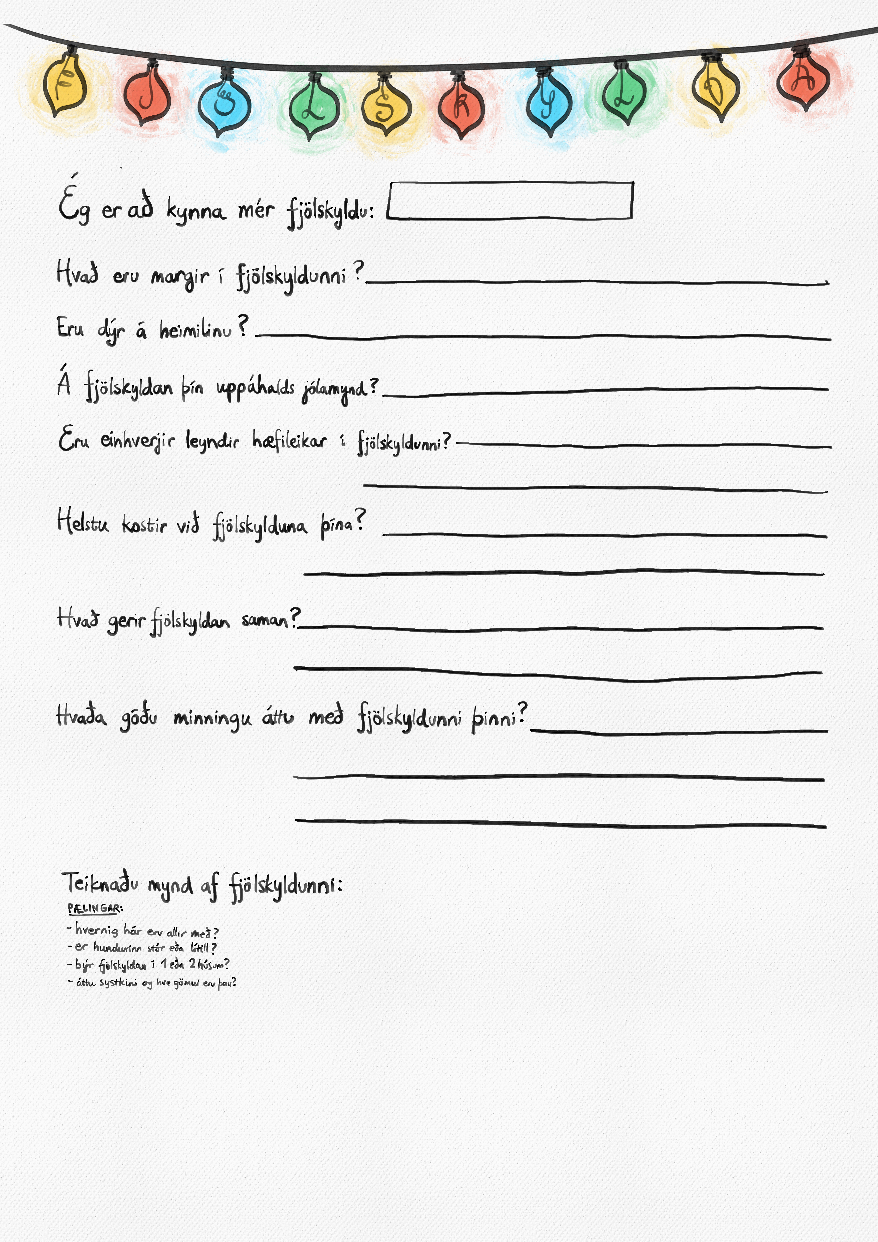 Nemendur vinna í pörum og skiptast á að spyrja spurninga um fjölskyldu hvor annars. Hægt er að styðjast við eða prenta beint úr spurningalistann sem fylgir með. Svo væri hægt að kynna fjölskyldu viðmælanda fyrir bekknum.