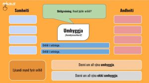 Nemendur leita að andheitum/andstæðum við orðin, setja orðin í setningar, taka dæmi og finna mynd sem lýsir orðinu/hugtakinu.